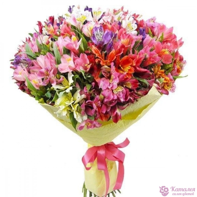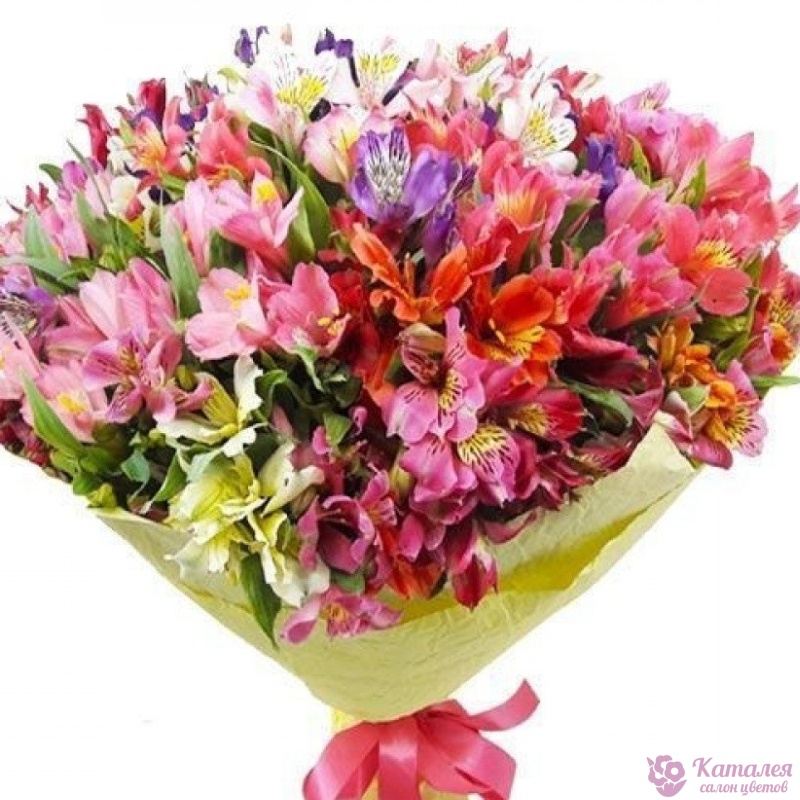 Букет состоит из 35 разноцветных альстромерий, красивая упаковка, атласная лента.