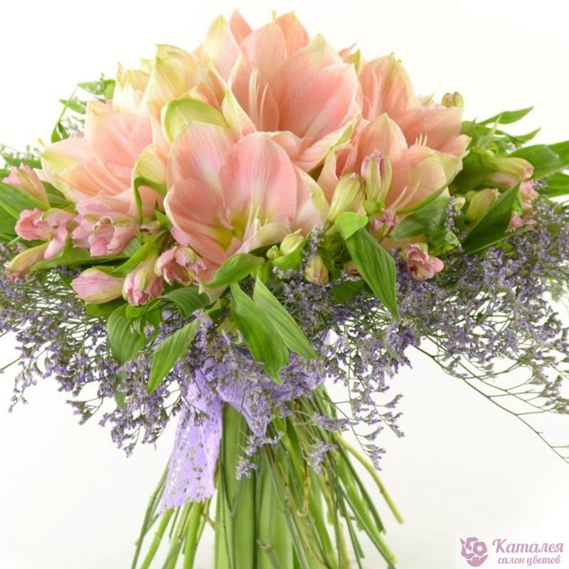 Букет состоит из 6 амариллисов, 12 веток альстромерий, 9 лимониум, прозрачная упаковка, атласная лента.