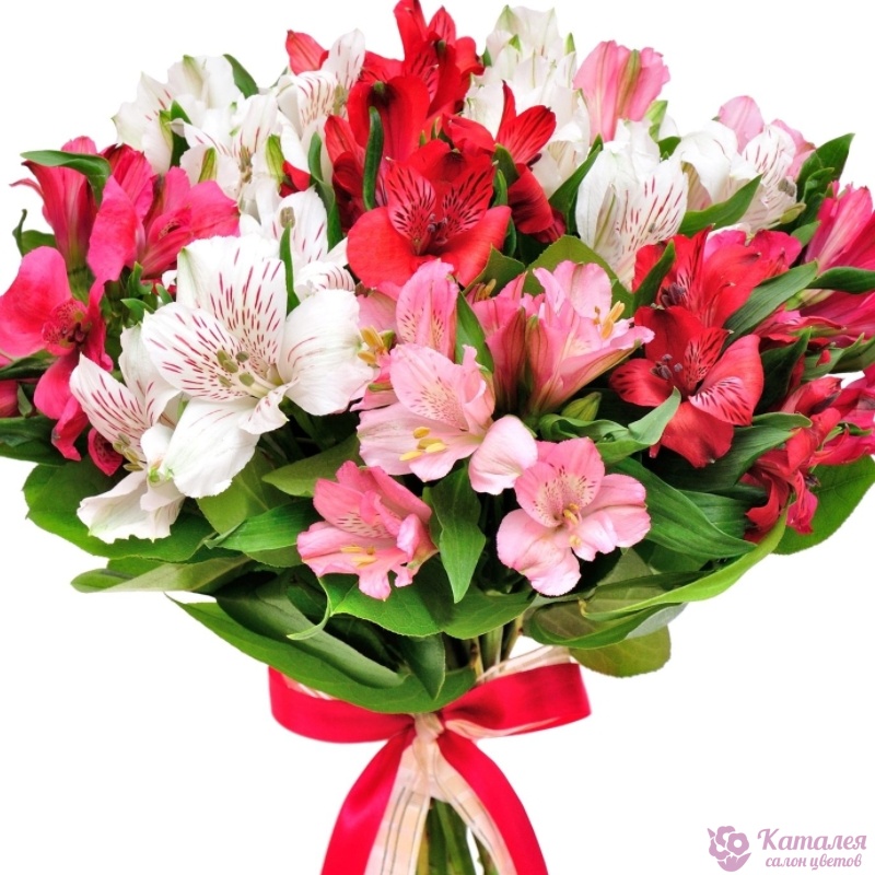 Букет состоит из MIX из 15 альстромерий, прозрачная упаковка, атласная лента.
