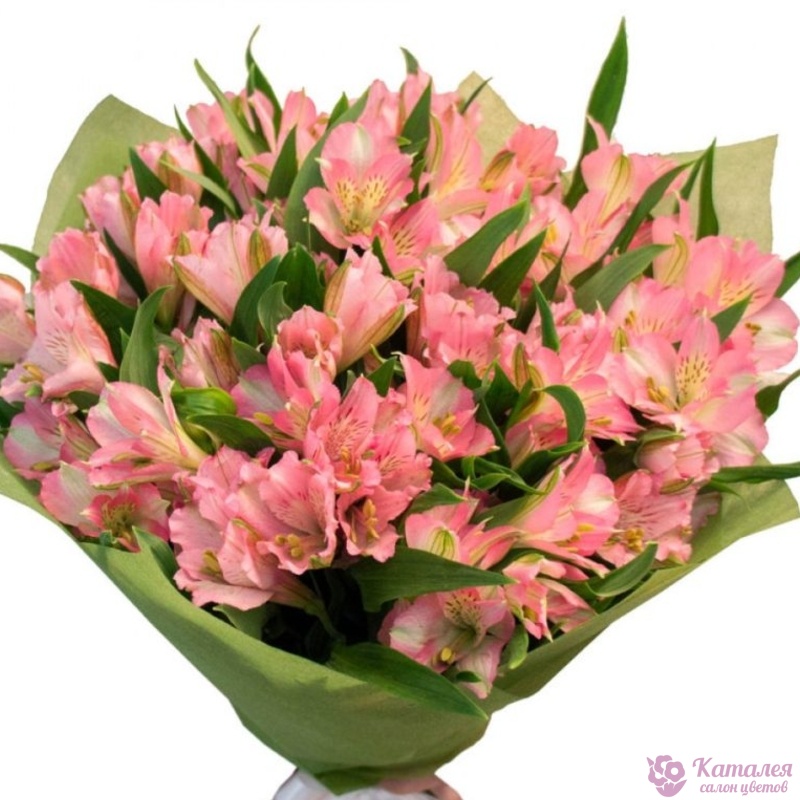 Букет состоит из 15 веток розовых альстромерий, зелень, красивая упаковка, атласная лента.
