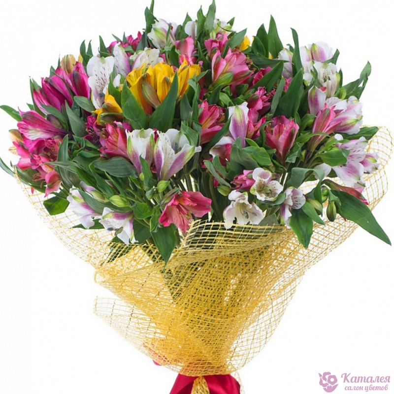 Букет состоит из MIX из 17 альстромерий, зелень, сетка, атласная лента.