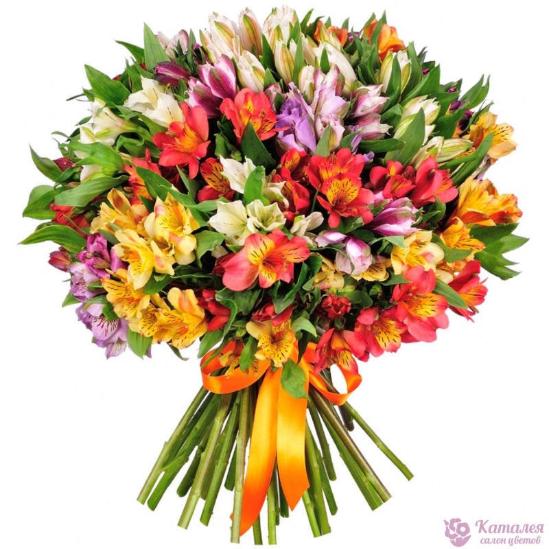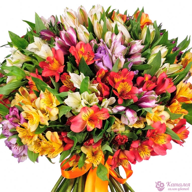 Букет состоит из MIX из 31 ветки альстромерий, прозрачная упаковка, атласная лента.