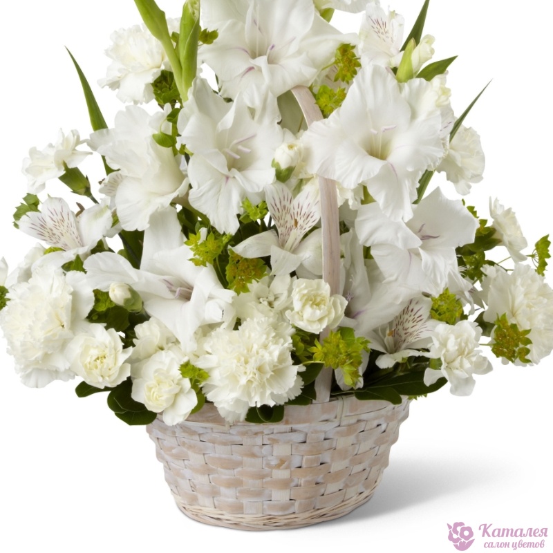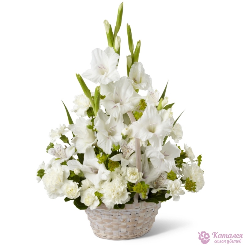 Букет состоит из 9 гладиолусов, 8 гвоздик, 4 ветки альстромерии, 6 веток кустовой гвоздики, зелень, корзина, оазис.