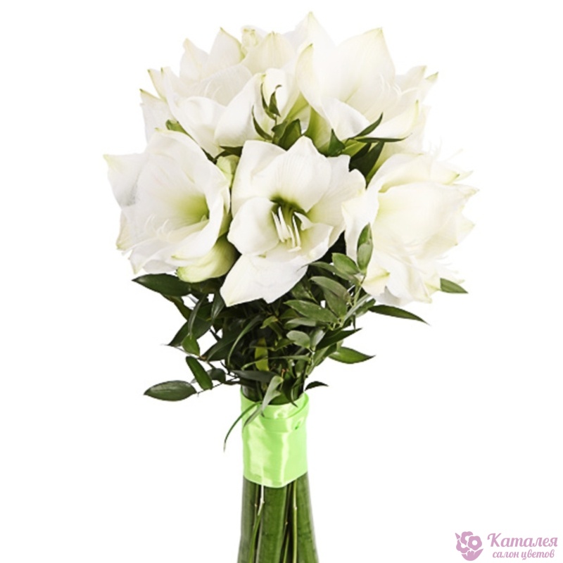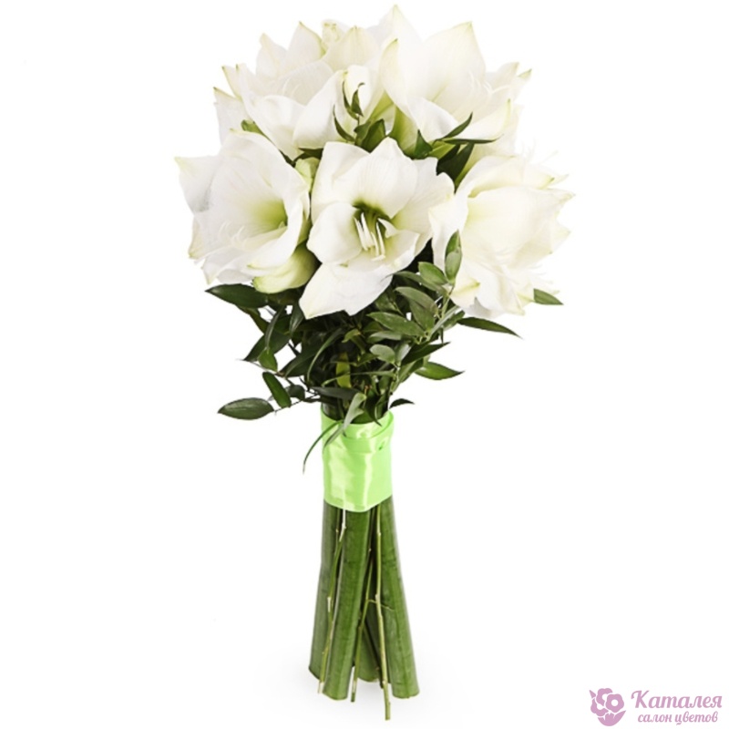 Букет состоит из 5 белых амариллисов, зелень, прозрачная упаковка, атласная лента.