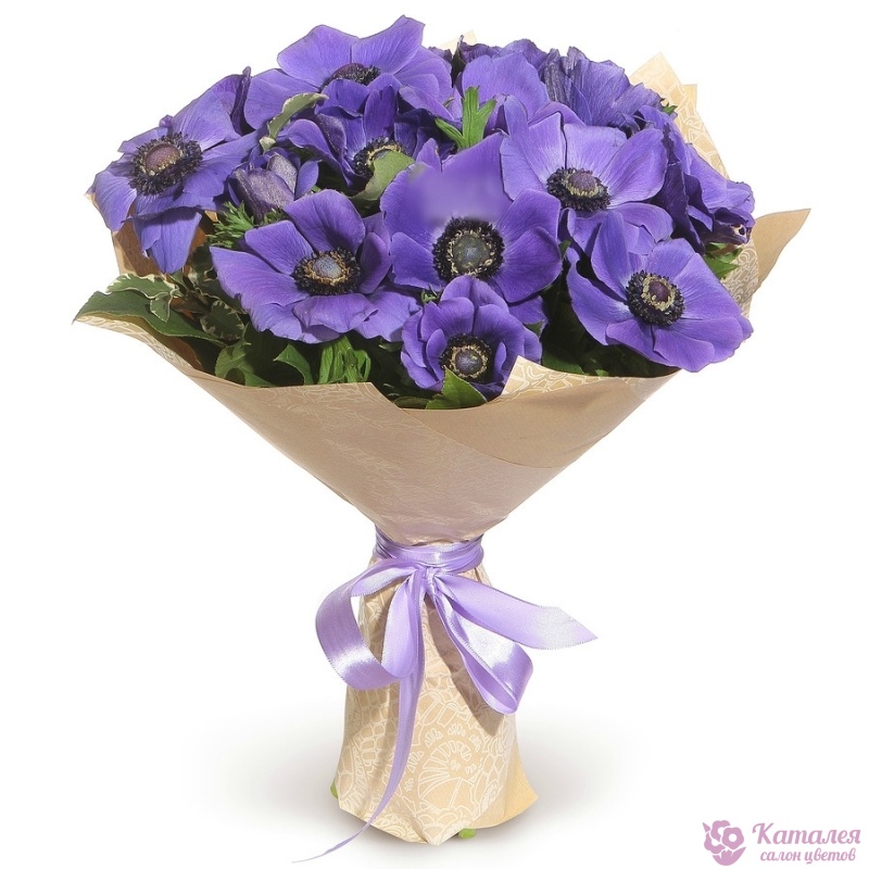 Букет состоит из 19 синих анемонов, зелень, крафт, атласная лента.