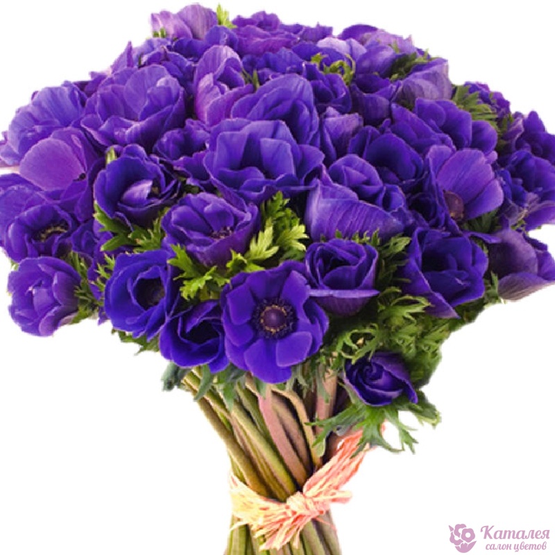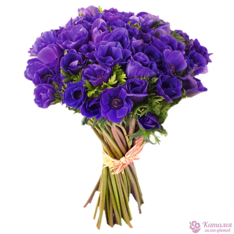Букет состоит из 51 синий анемон, прозрачная упаковка, атласная лента.