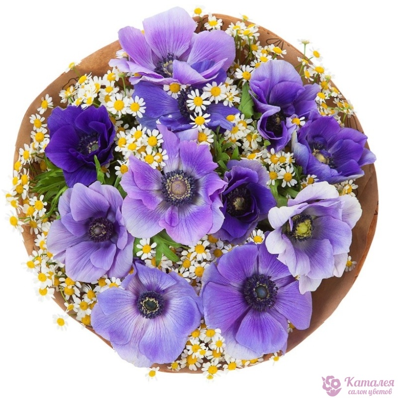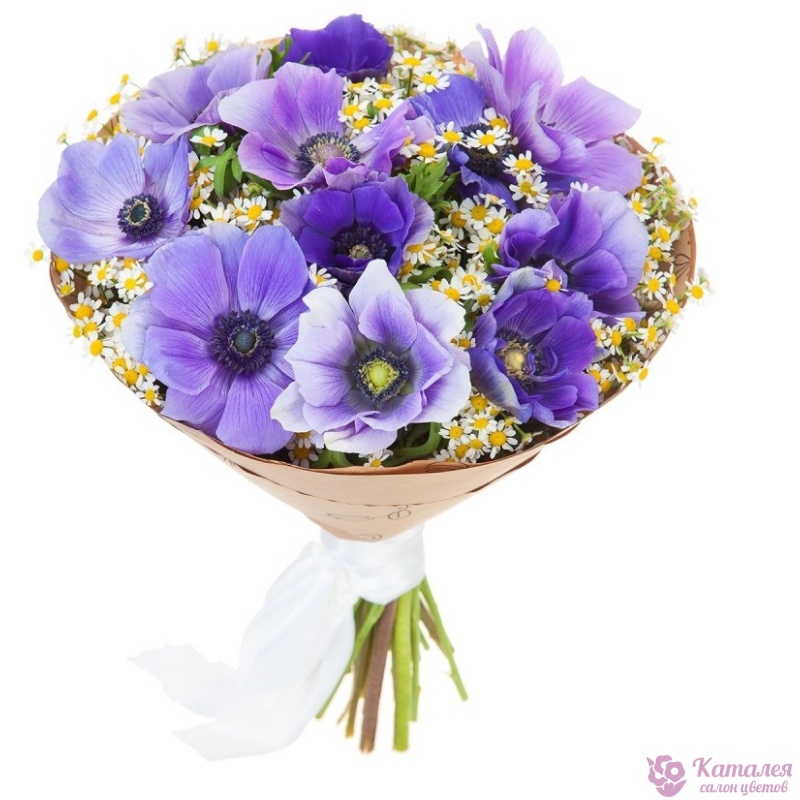 Букет состоит из 11 анемонов, 10 веток танацетума, крафт, атласная лента.