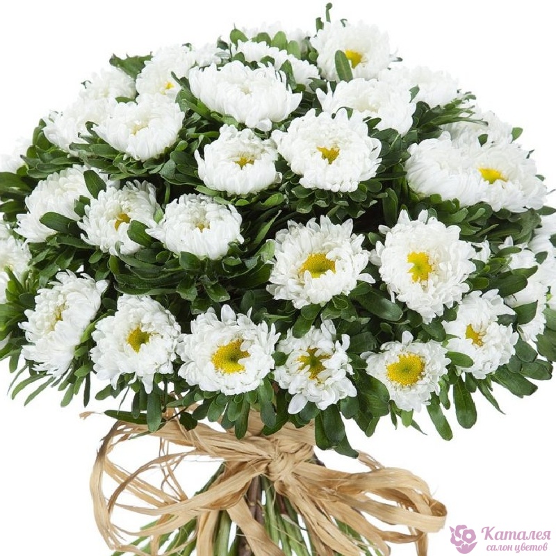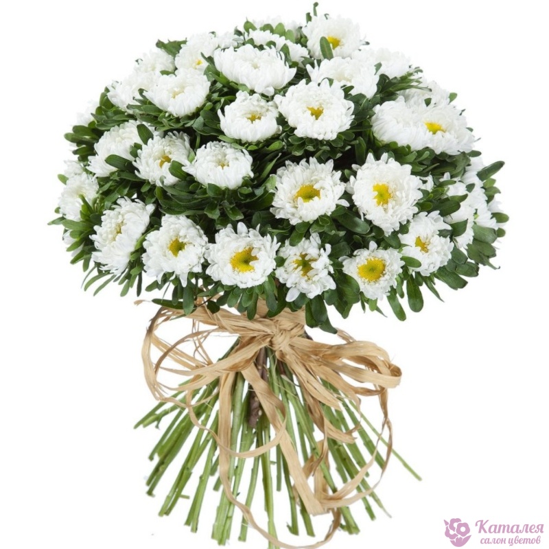 Букет состоит из 51 белая астра, прозрачная упаковка, лента.
