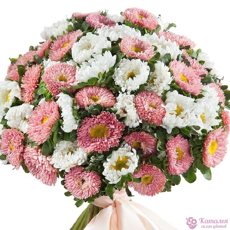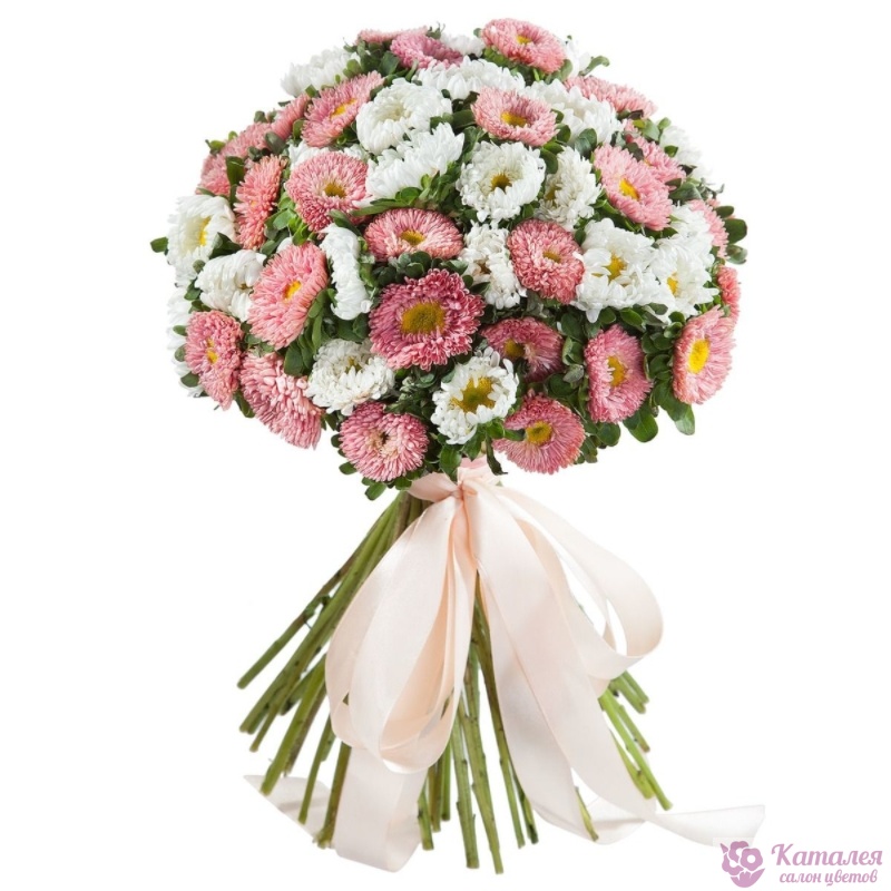 Букет состоит из 23 белые астры, 22 розовые астры, зелень, прозрачная упаковка, атласная лента.