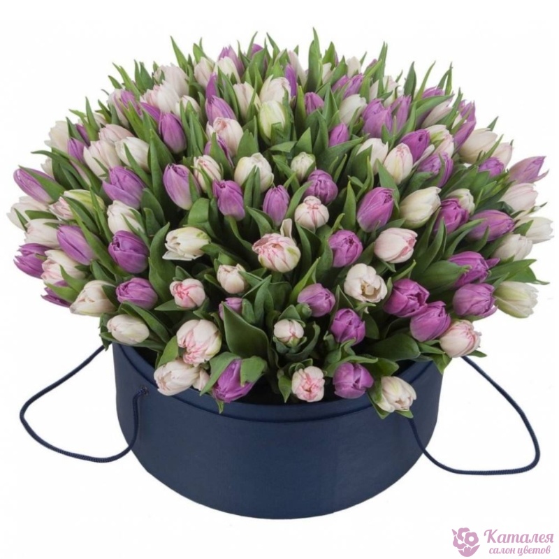 Букет состоит из 51 сиреневый тюльпан, 50 белых тюльпанов, коробка, оазис.