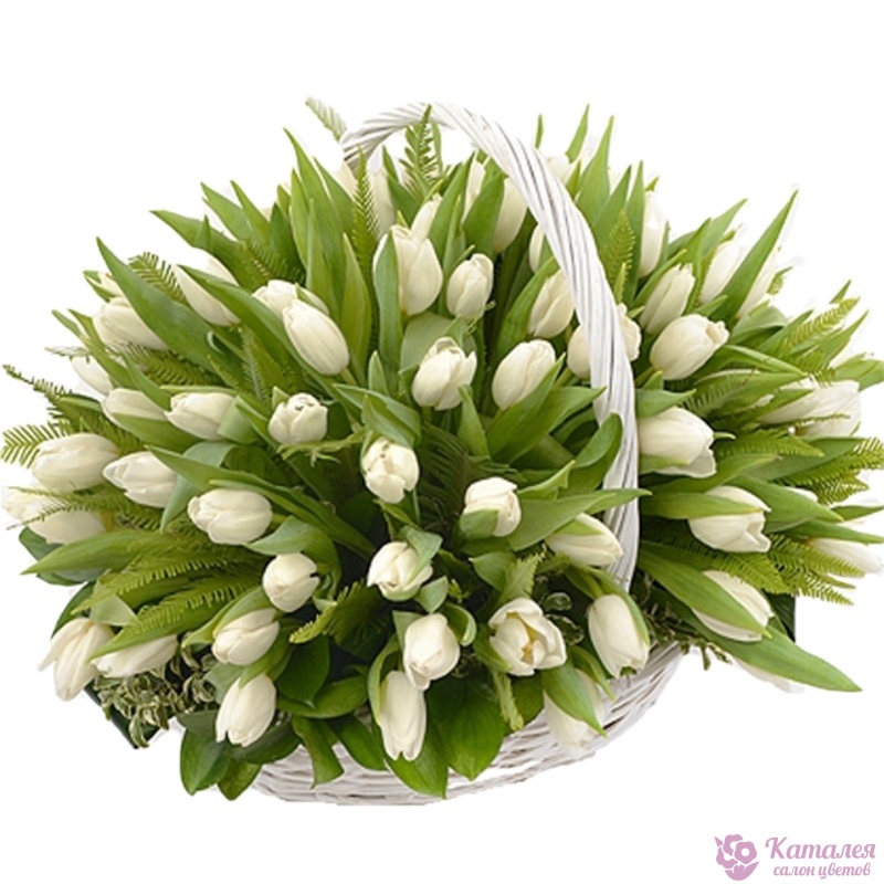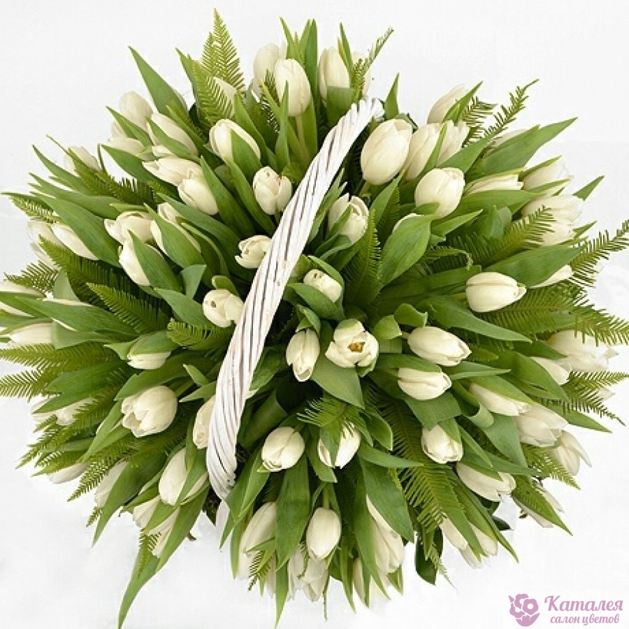 101 белый тюльпан, зелень, корзина.