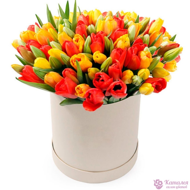 Букет состоит из 51 красный тюльпан, 50 желтых тюльпанов, коробка, оазис.