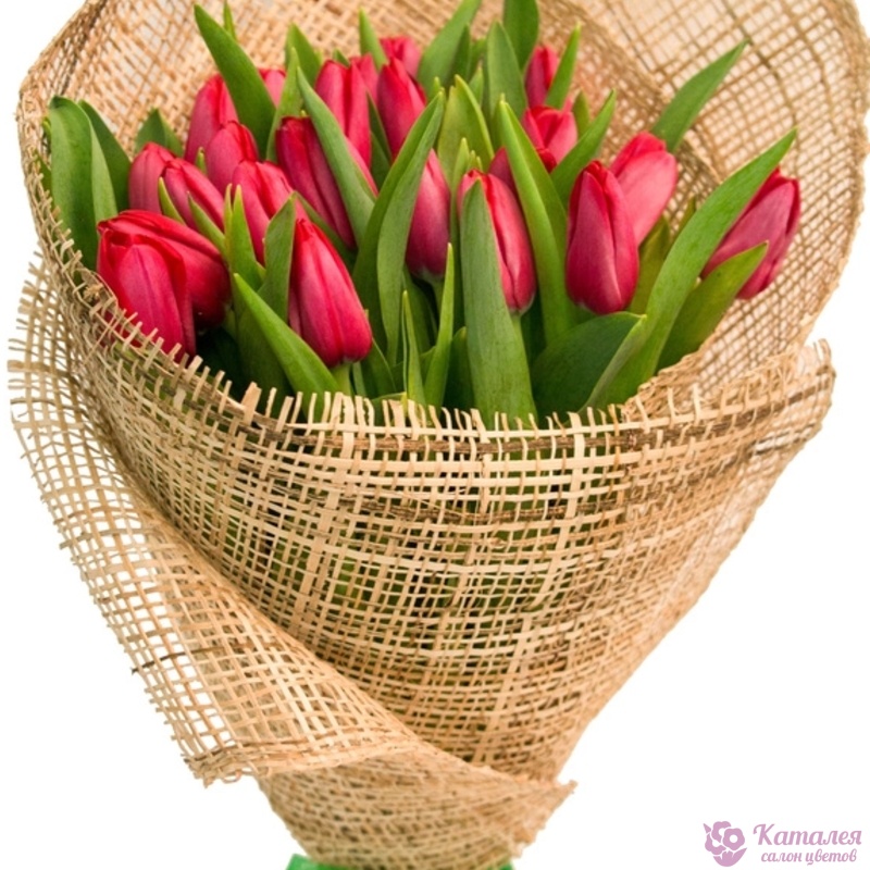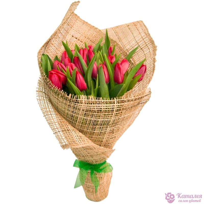 Букет состоит из 21 красный тюльпан, красивая упаковка, атласная лента.