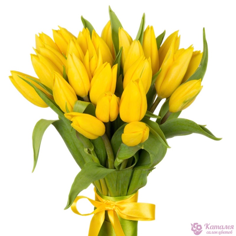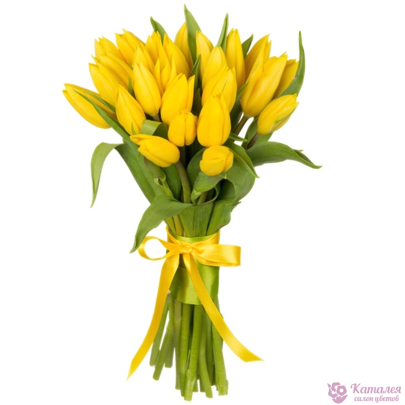 Букет состоит из 21 желтый тюльпан, прозрачная упаковка, атласная лента.