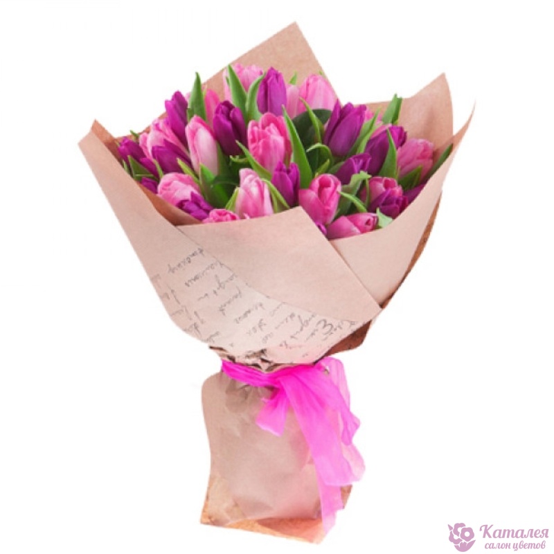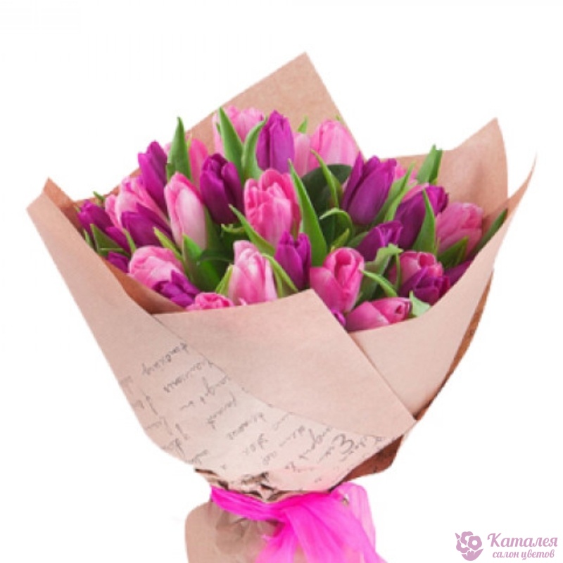 Букет состоит из 13 сиреневых тюльпанов, 12 розовых тюльпанов, крафт, атласная лента.