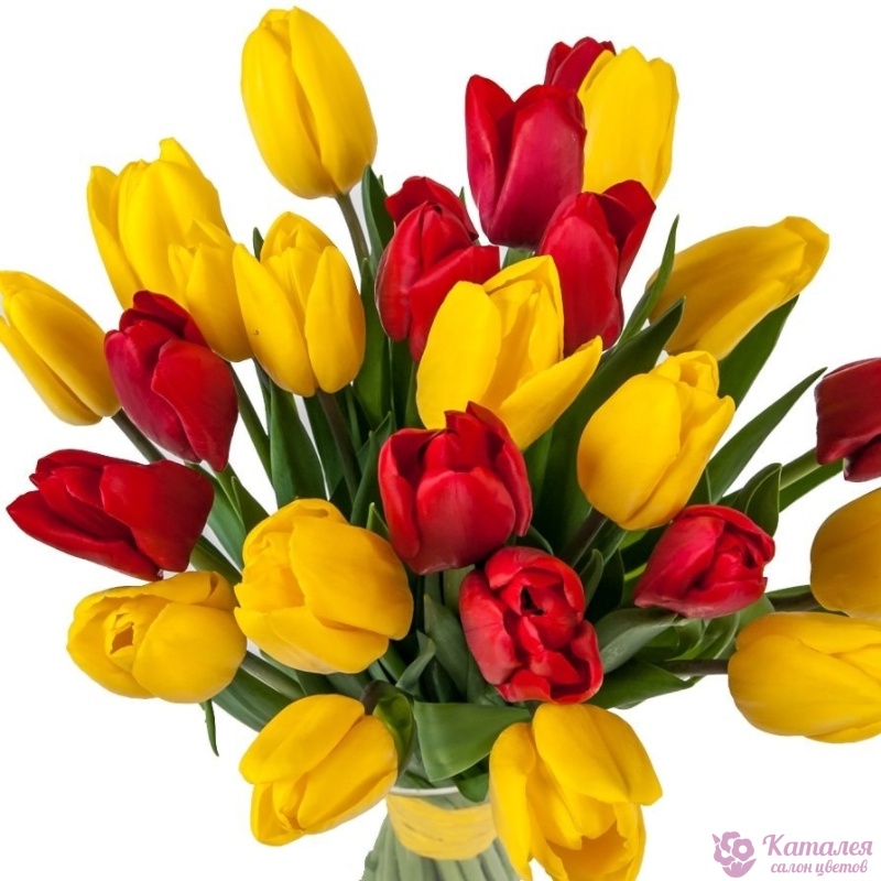 Букет состоит из 13 желтых тюльпанов, 12 красных тюльпанов, прозрачная упаковка.