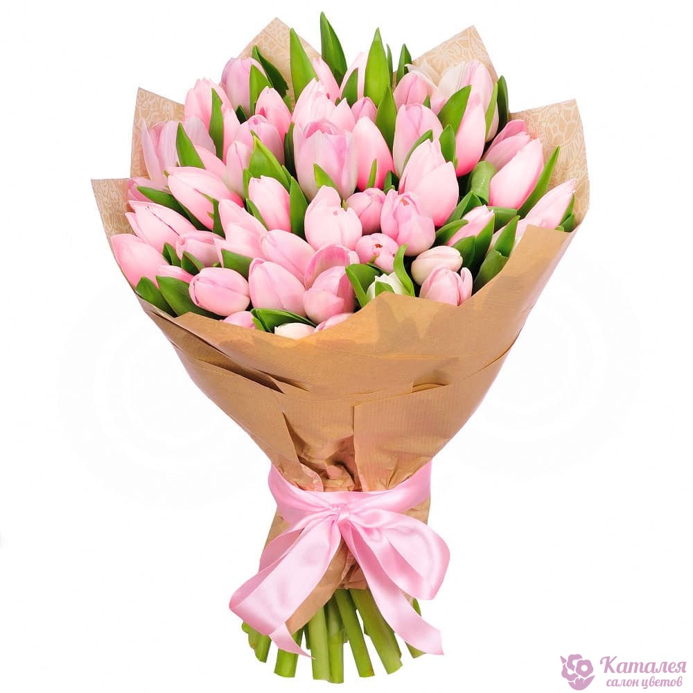Букет состоит из 13 белых тюльпанов, 12 розовых тюльпанов, крафт, лента.