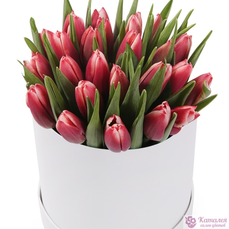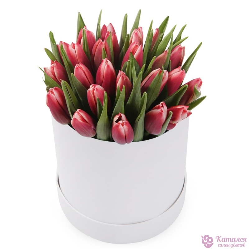 Букет состоит из 25 красных тюльпанов, коробка, оазис.