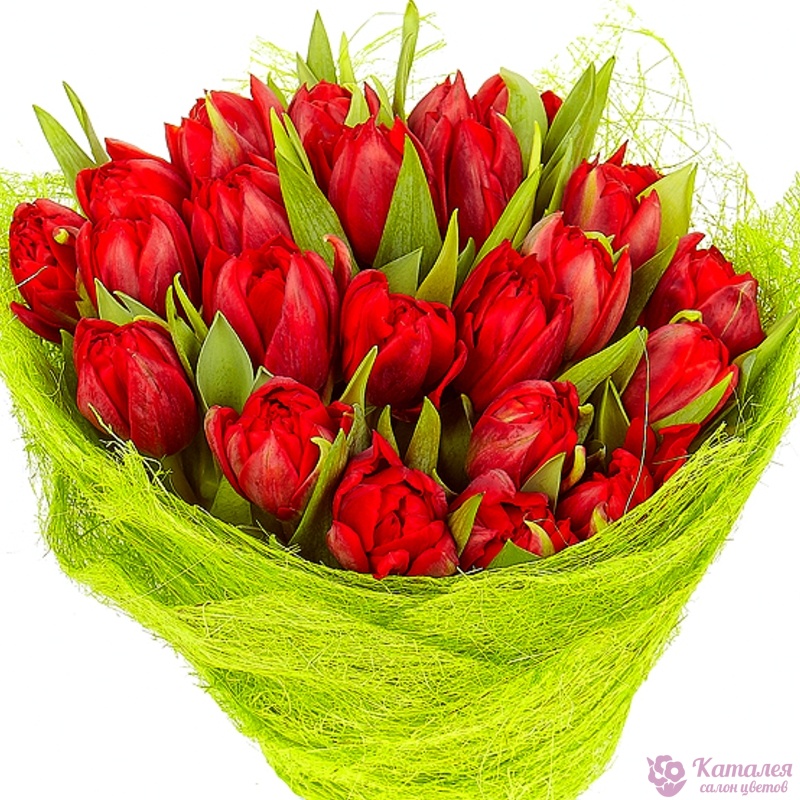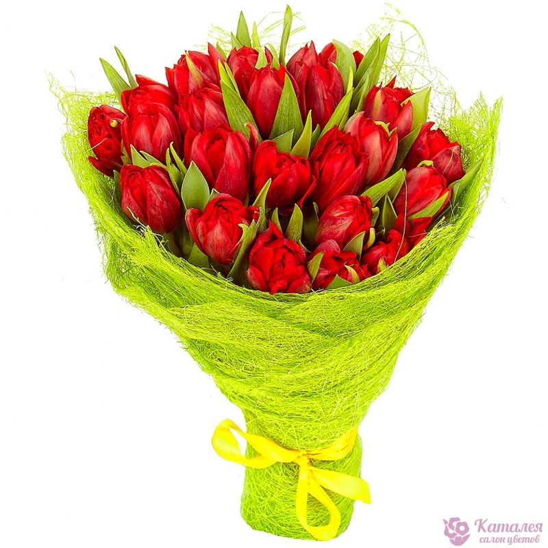 Букет состоит из 25 красных тюльпанов, красивая упаковка, атласная лента.