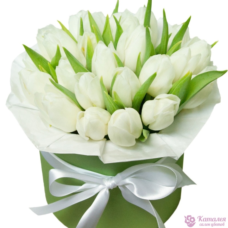 Букет состоит из 25 тюльпанов, коробка, атласная лента, оазис.