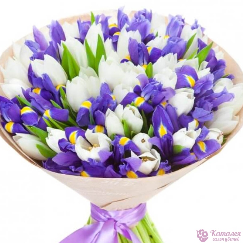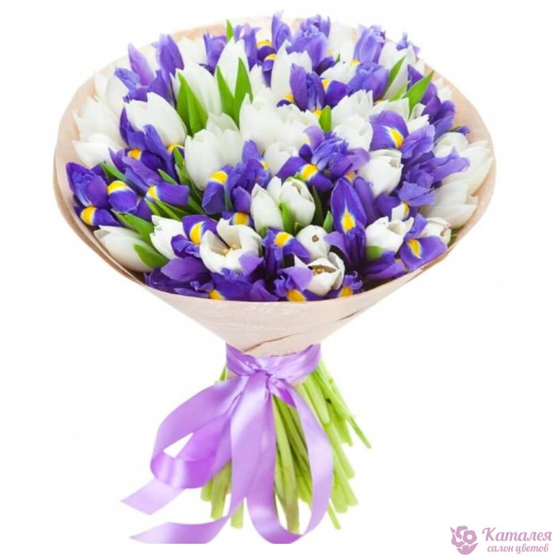 Букет состоит из 26 ирисов, 25 белых тюльпанов, крафт, атласная лента.