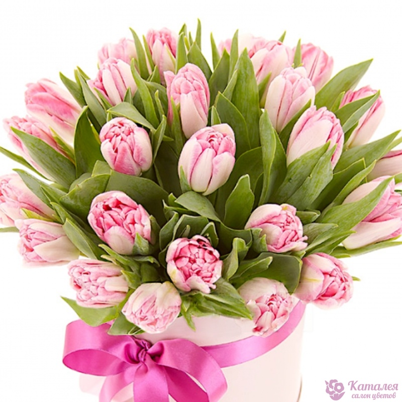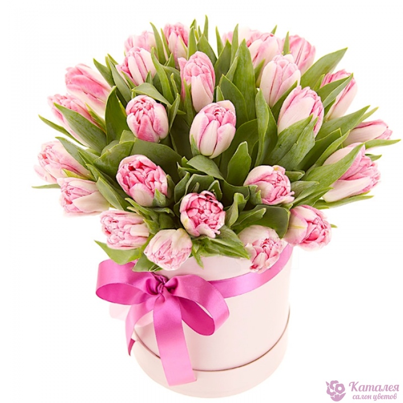 Букет состоит из 25 розовых тюльпанов, коробка, атласная лента, оазис.