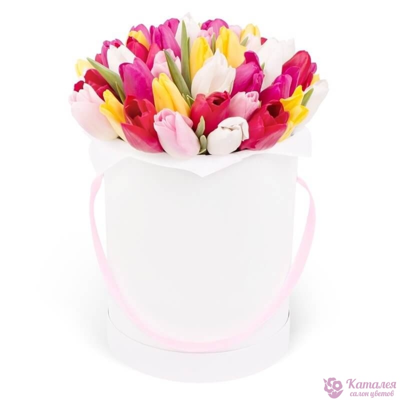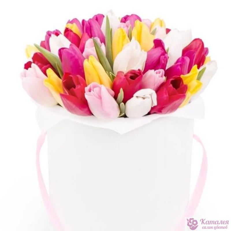 Букет состоит из MIX из 35 тюльпанов, коробка, оазис.