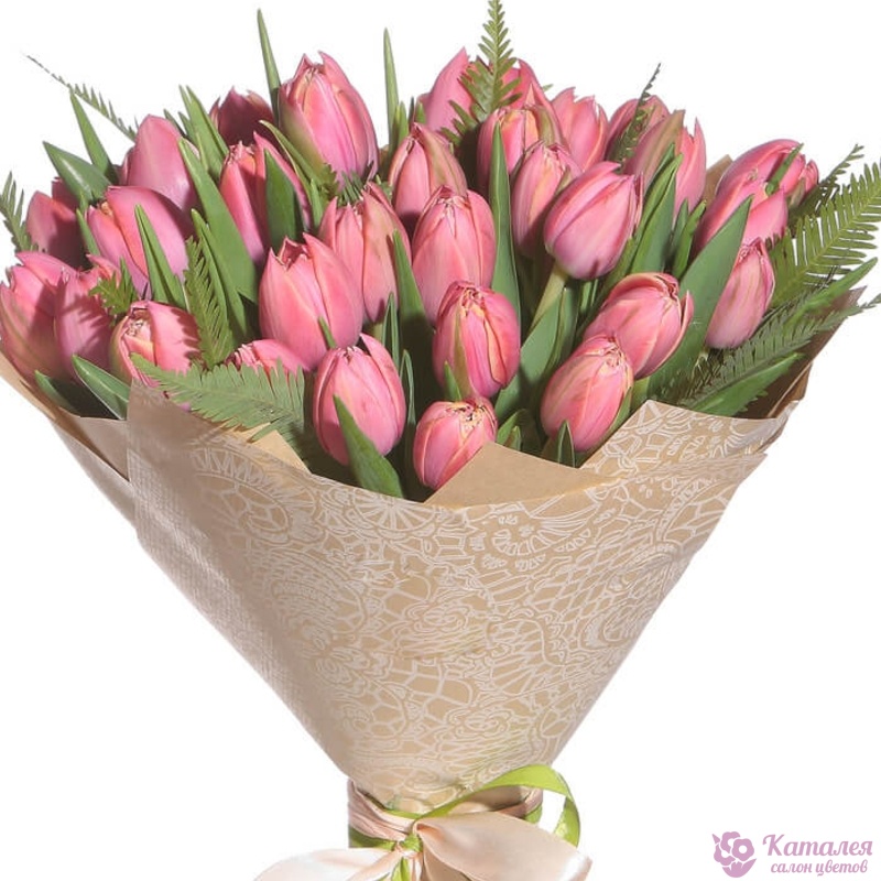 Букет состоит из 35 розовых тюльпанов, зелень, крафт, атласная лента.