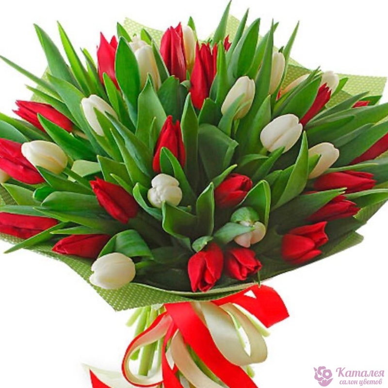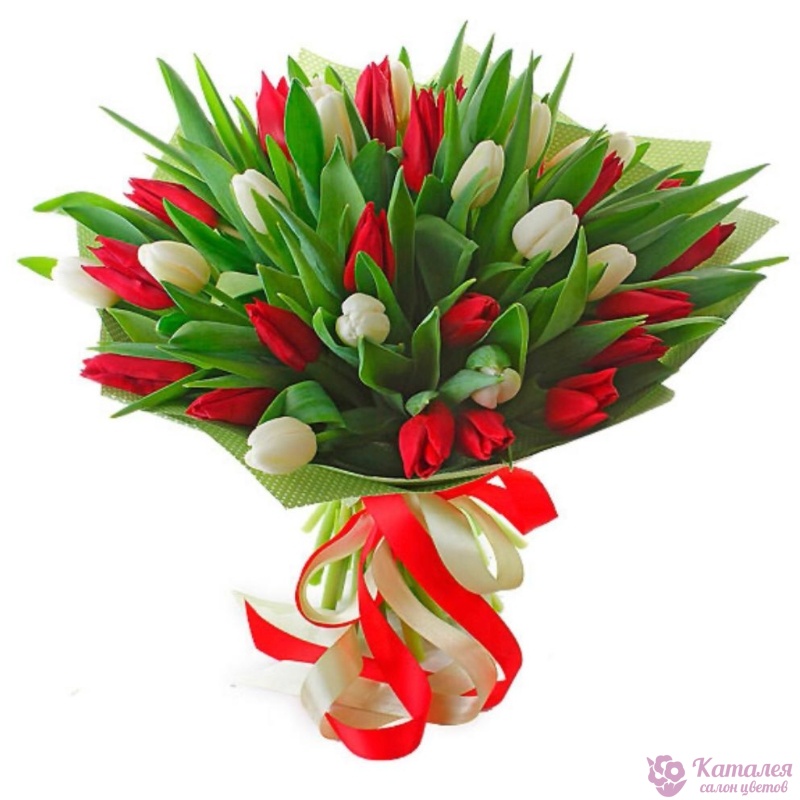 Букет состоит из 18 красных тюльпанов, 17 белых тюльпанов, красивая упаковка, атласная лента.