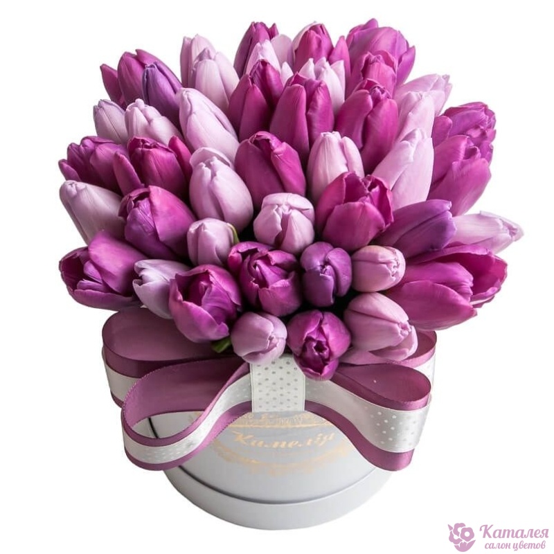 Букет состоит из 51 сиреневый тюльпан, коробка, атласная лента, оазис.