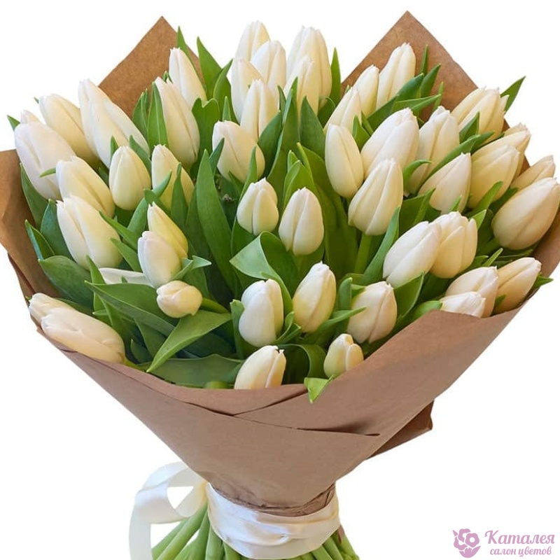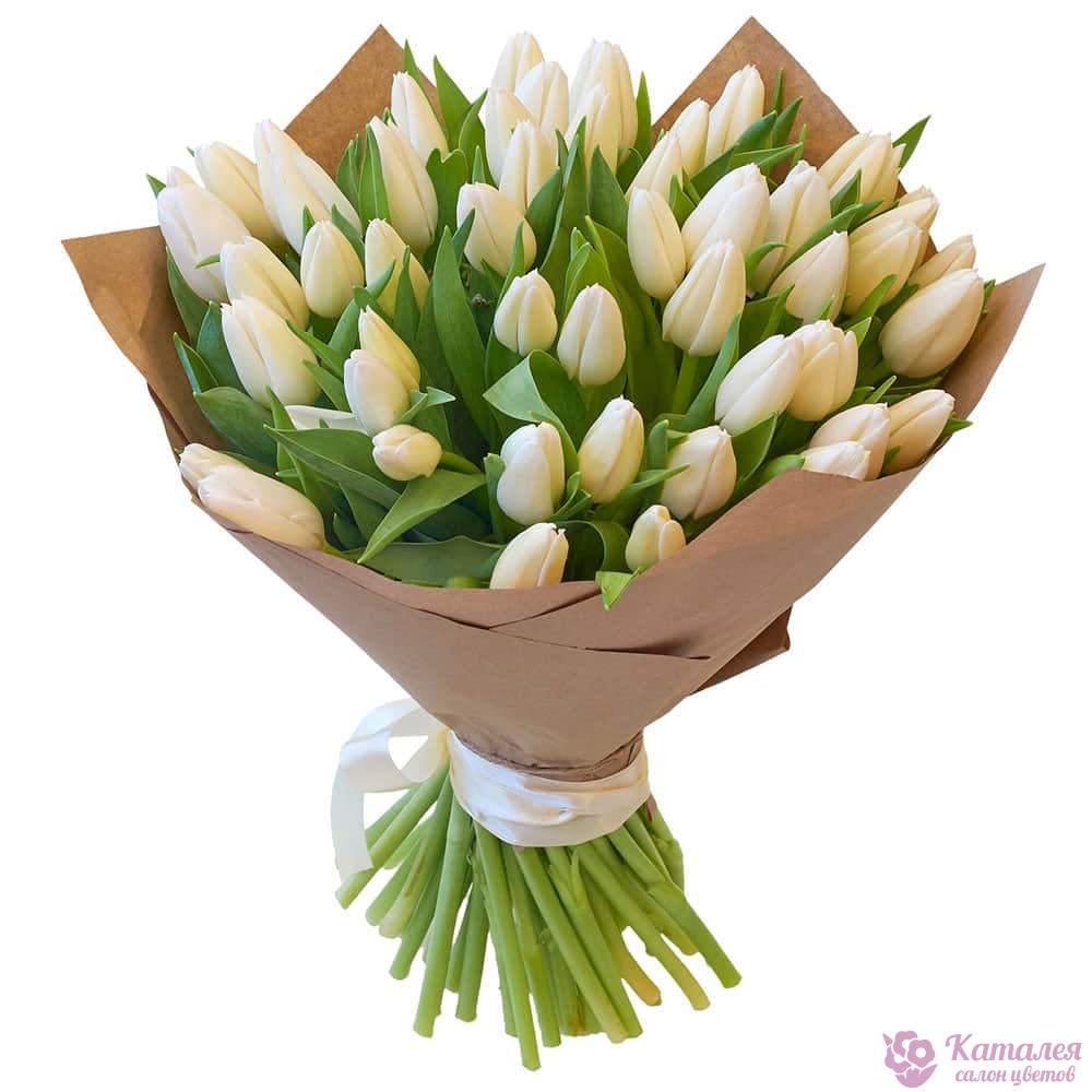 Букет состоит из 51 белый тюльпан, крафт, белая лента.