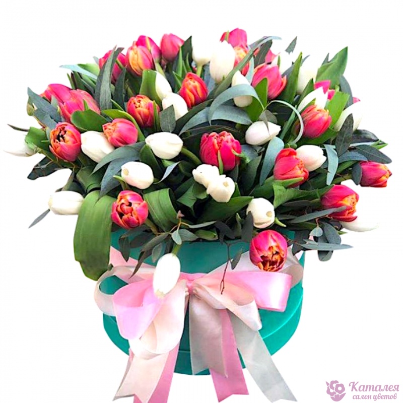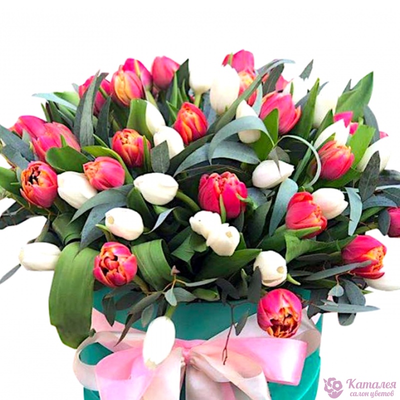 Букет состоит из 26 красных тюльпанов, 25 розовых тюльпанов, зелень, атласная лента, коробка, оазис.