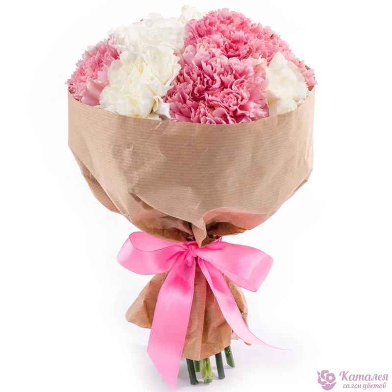 Букет состоит из 8 белых гвоздик, 7 розовых гвоздик, крафт, атласная лента.