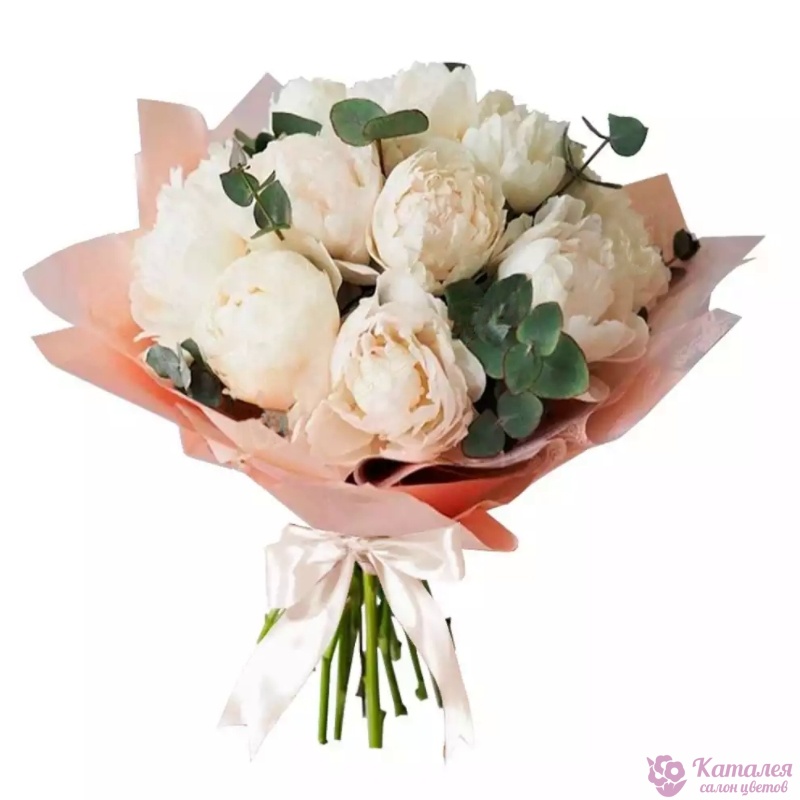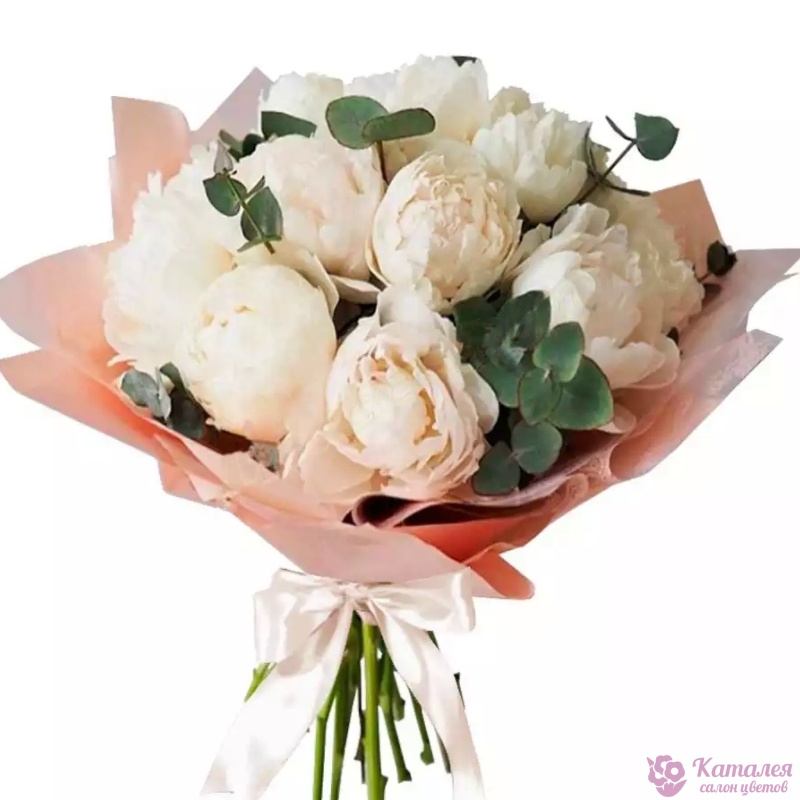 Букет состоит из 13 белых пионов, эвкалипт, красивая упаковка, атласная лента.