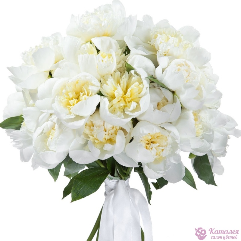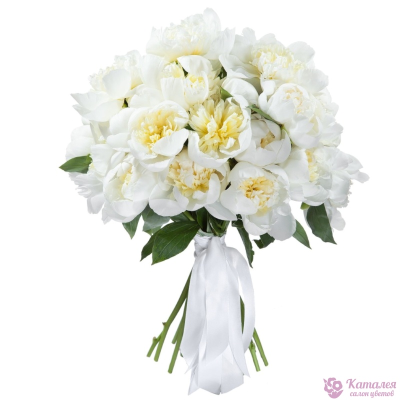 Букет состоит из 31 белый пион, прозрачная упаковка, атласная лента.
