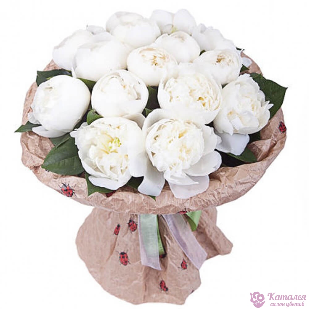 Букет состоит из 15 белых пионов, крафт, атласная лента.