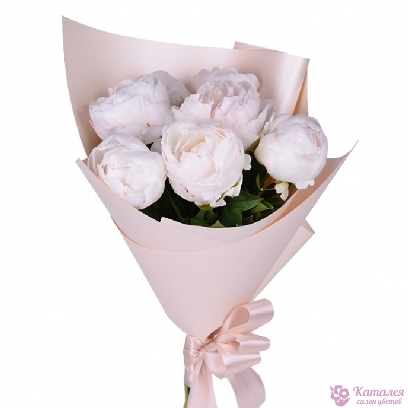 Букет состоит из 7 белых пионов, красивая упаковка, атласная лента.