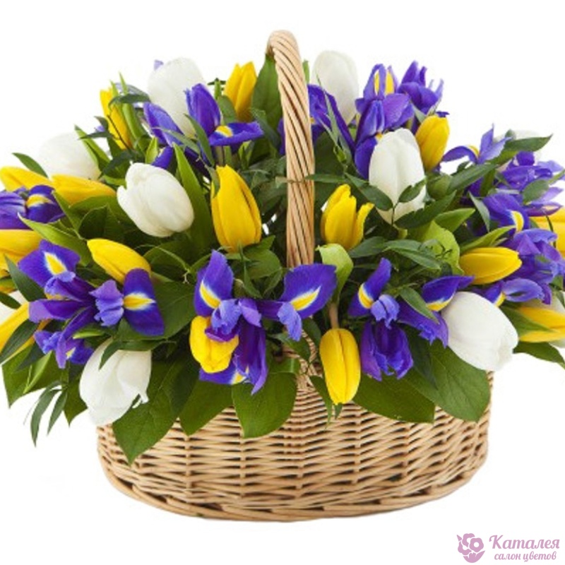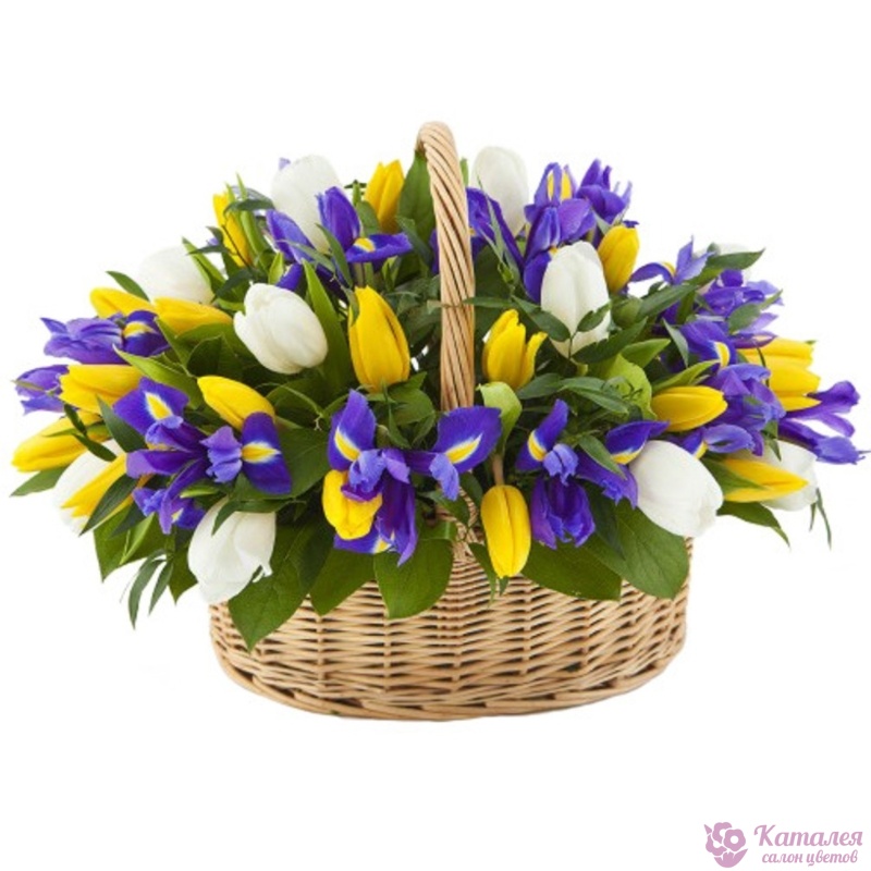 30 желтых и белых тюльпанов, 19 ирисов, рускус, корзина, оазис.