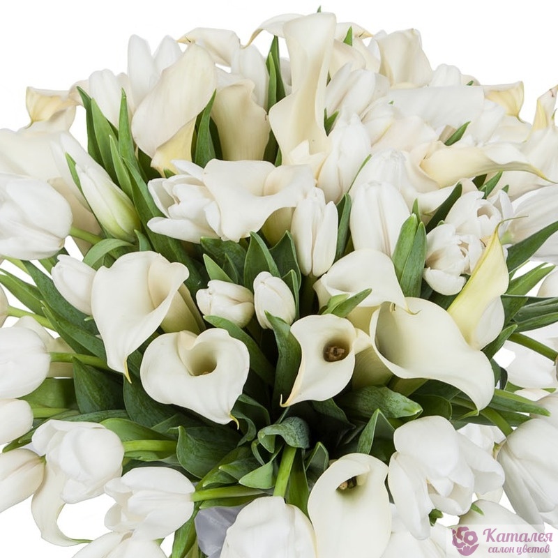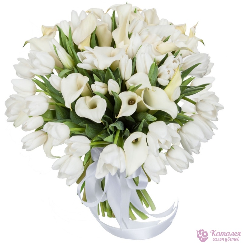 Букет состоит из 15 белых калл, 40 белых тюльпанов, прозрачная упаковка, атласная лента.
