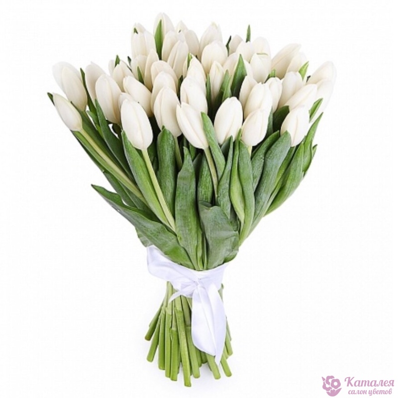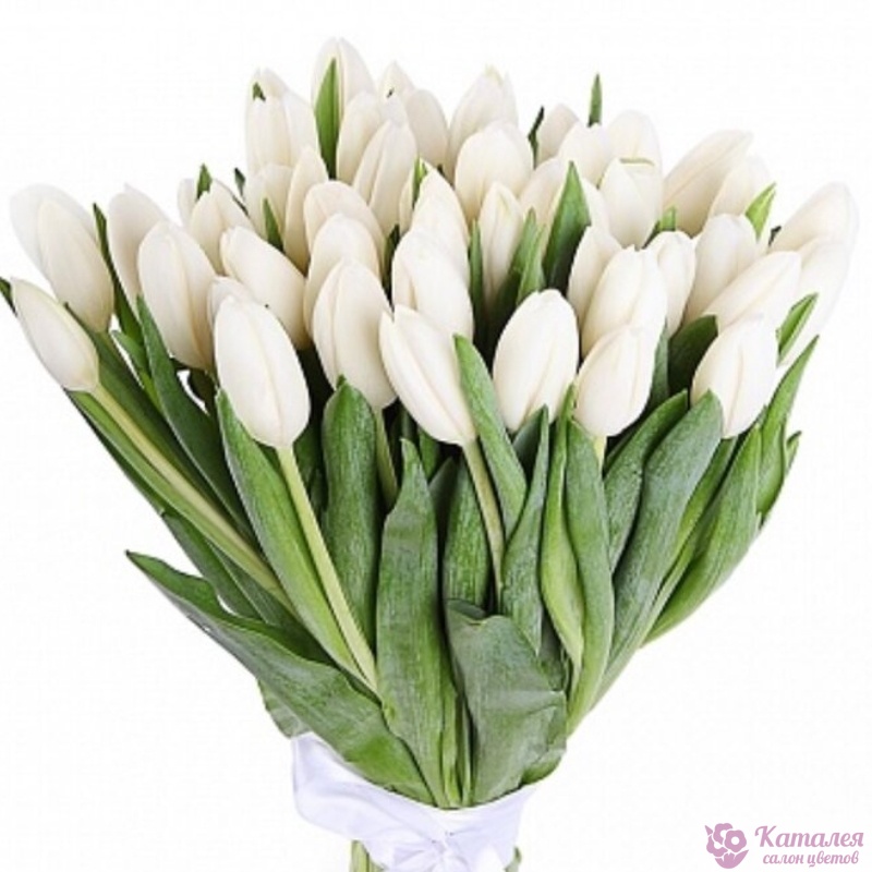 Букет состоит из 31 белый тюльпан, прозрачная упаковка, атласная лента.