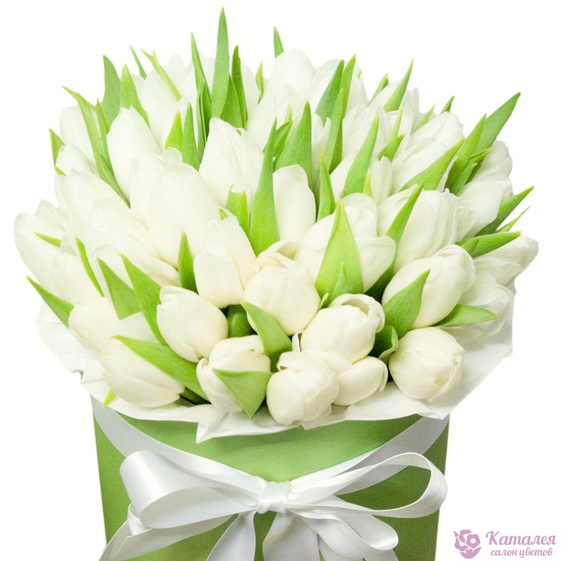 Букет состоит из 45 белых тюльпанов, коробка, атласная лента, оазис.