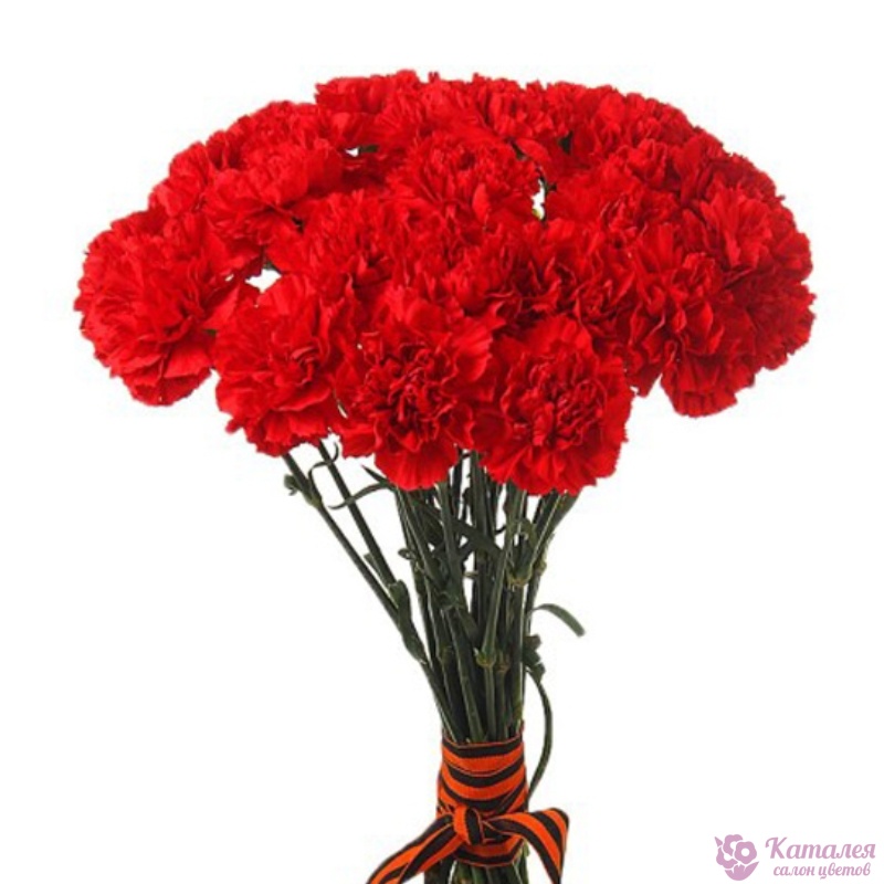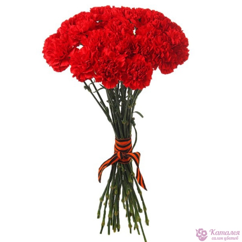 Букет состоит из 21 красная гвоздика, прозрачная упаковка, атласная лента.