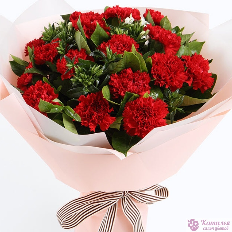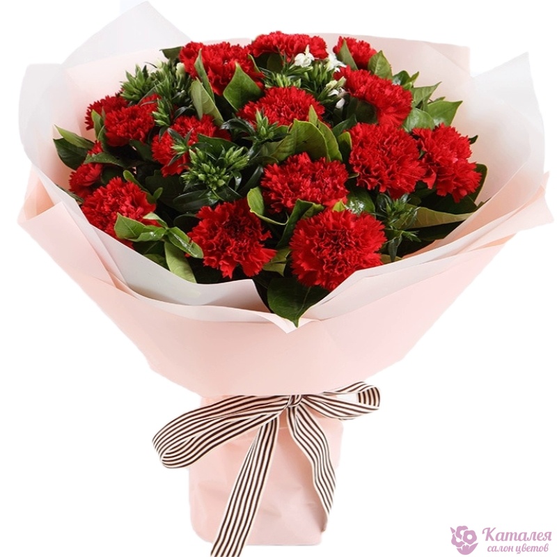Букет состоит из 17 красных гвоздик, зелень, красивая упаковка, атласная лента.