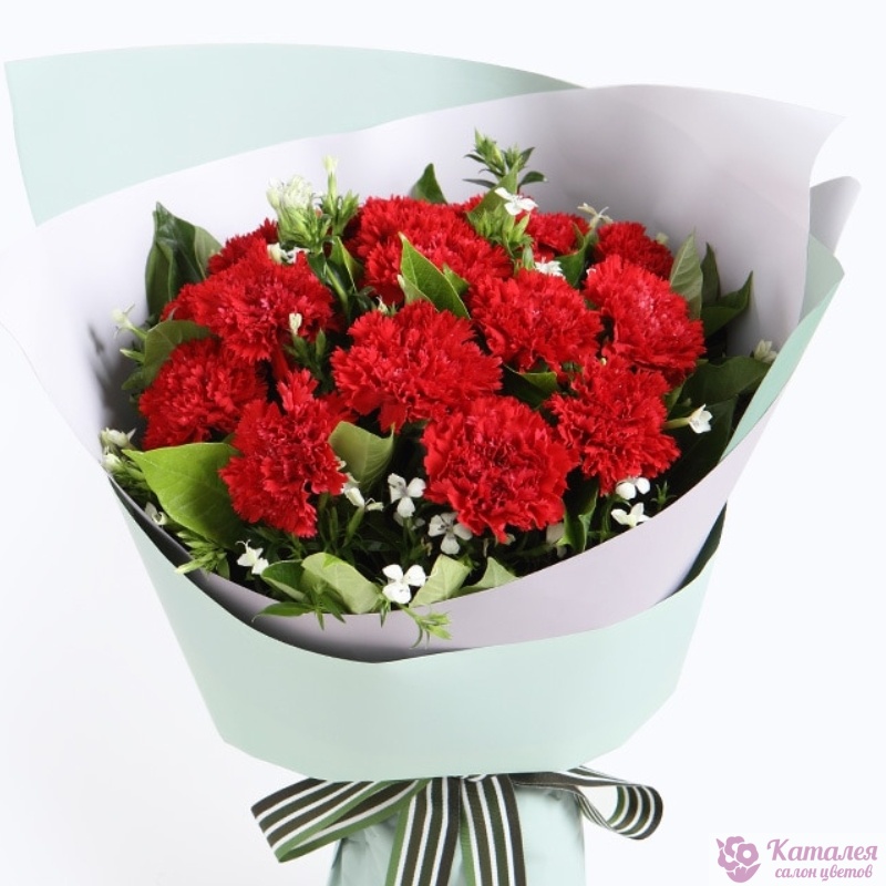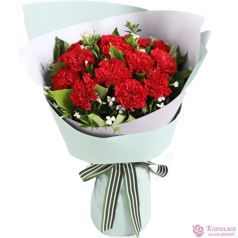 Букет состоит из 15 красных гвоздик, 2 ветки акации, зелень, красивая упаковка, атласная лента.