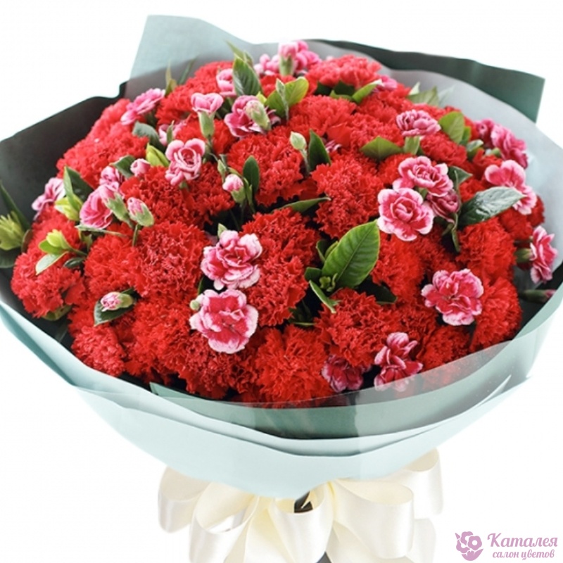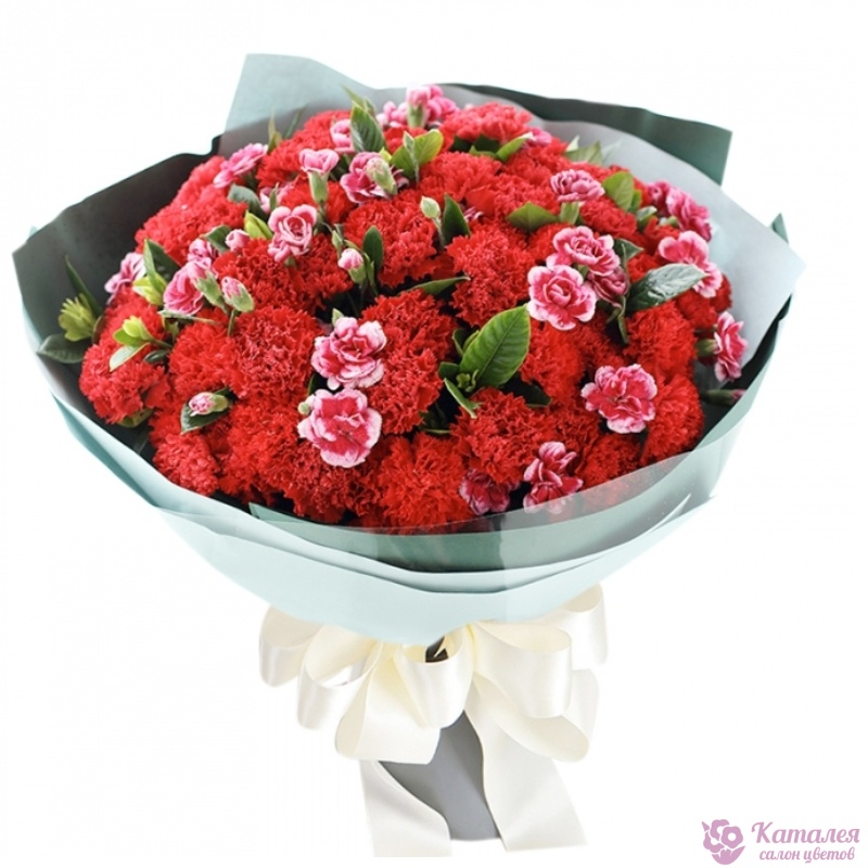 Букет состоит из 35 красных гвоздик, 10 кустовых гвоздик, красивая упаковка, атласная лента.