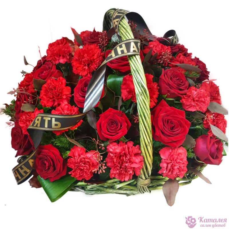 16 красных роз, 20 красных гвоздик, зелень, корзина, оазис, траурная лента.