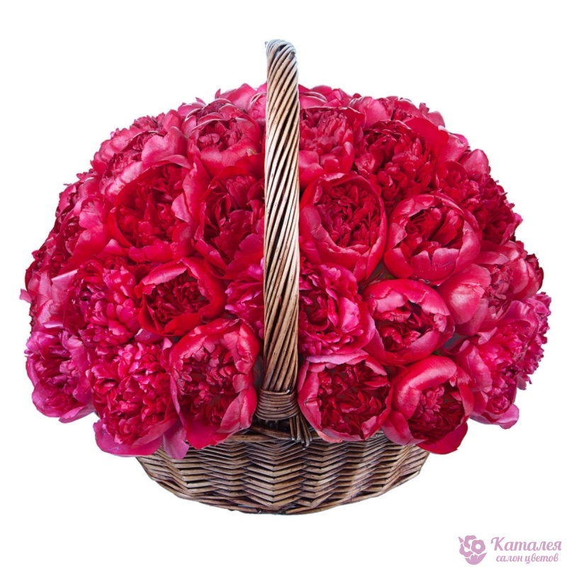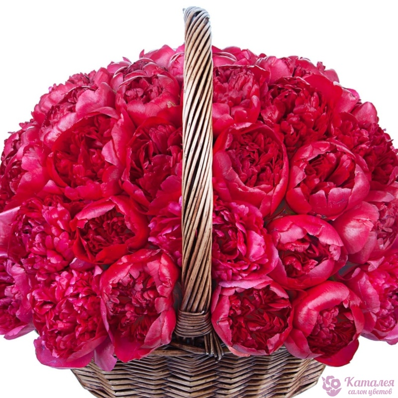 Букет состоит из 45 красных пионов, корзина, оазис.