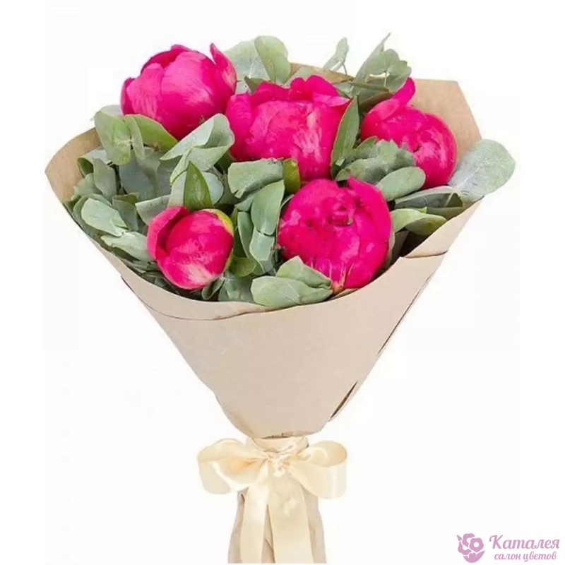 Букет состоит из 5 красных пионов, эвкалипт, крафт, атласная лента.