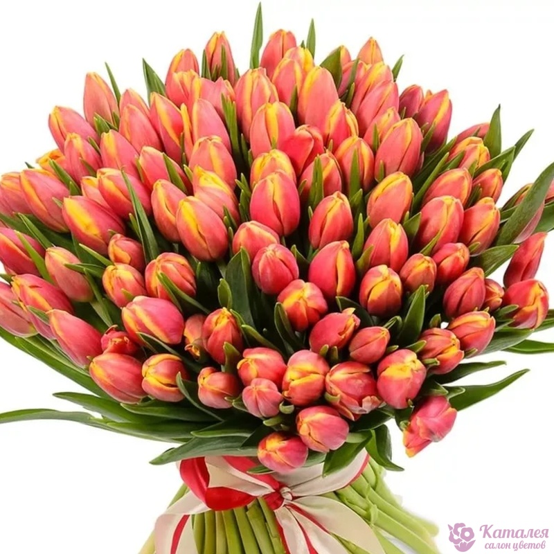 Букет состоит из 75 голландских тюльпанов, прозрачная упаковка, атласная лента.