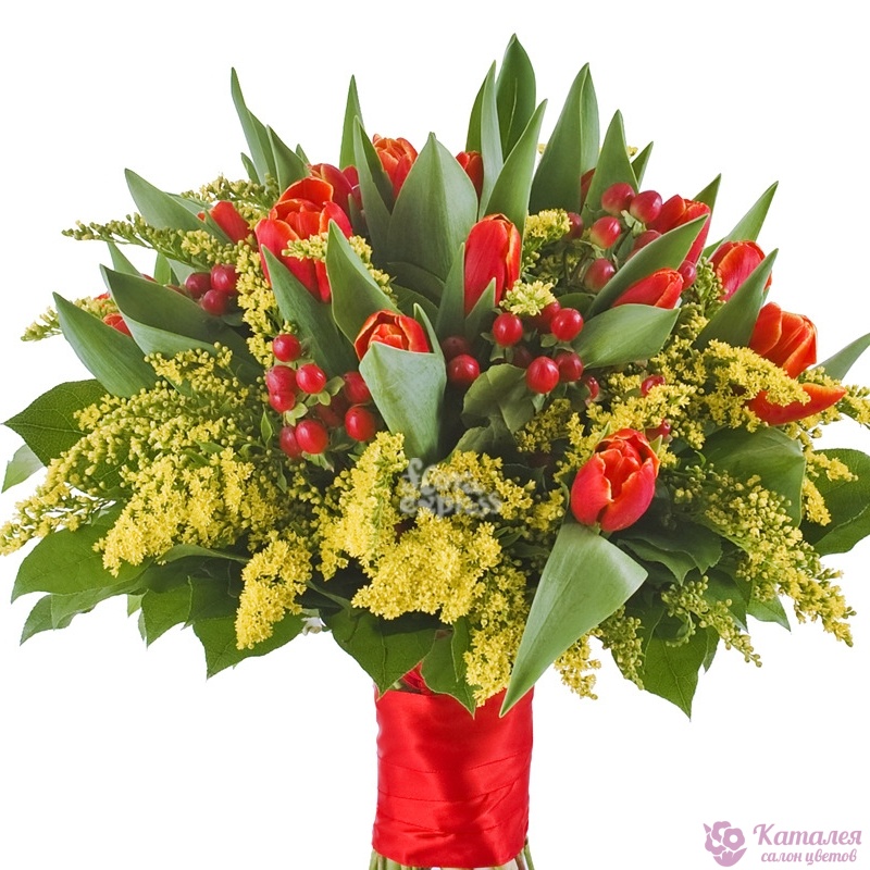 Гиперикум 5 шт., Мимоза 11 шт., Тюльпан 15 шт. |